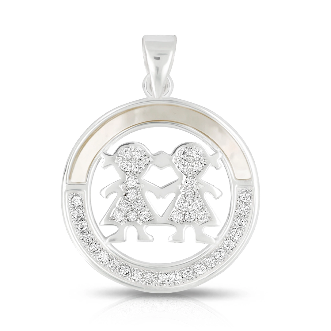 Pingente de Prata Redondo com Duas Meninas, Zircônias e Madrepérola