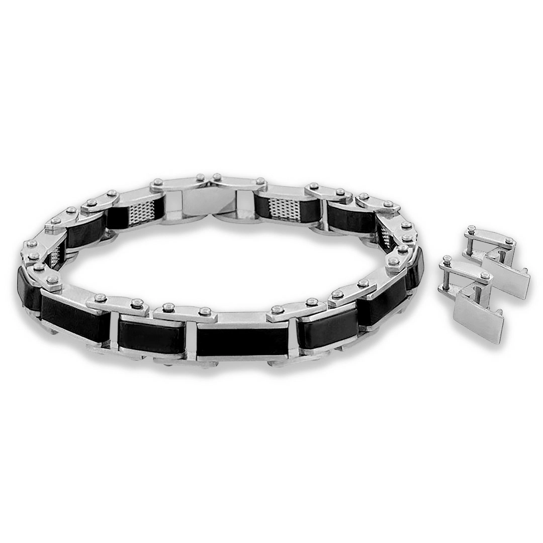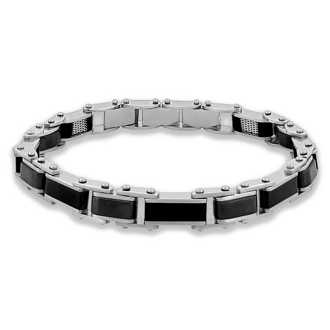 Pulseira de Aço com Elos Trabalhados e Fibra de Carbono