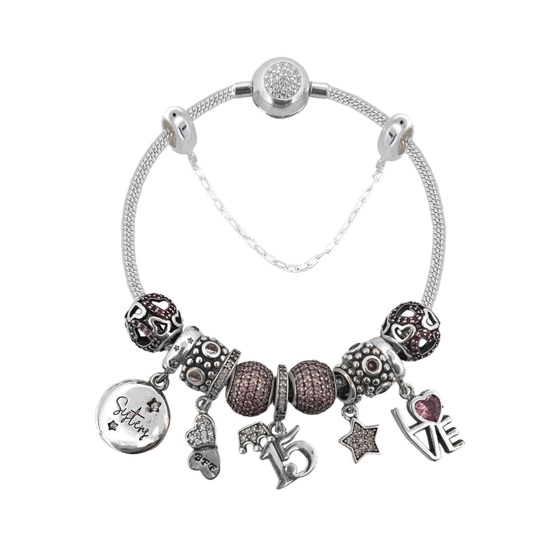 Pulseira com trava de segurança, berloques de zircônias rosa, zircônias cristal e envelhecidos.