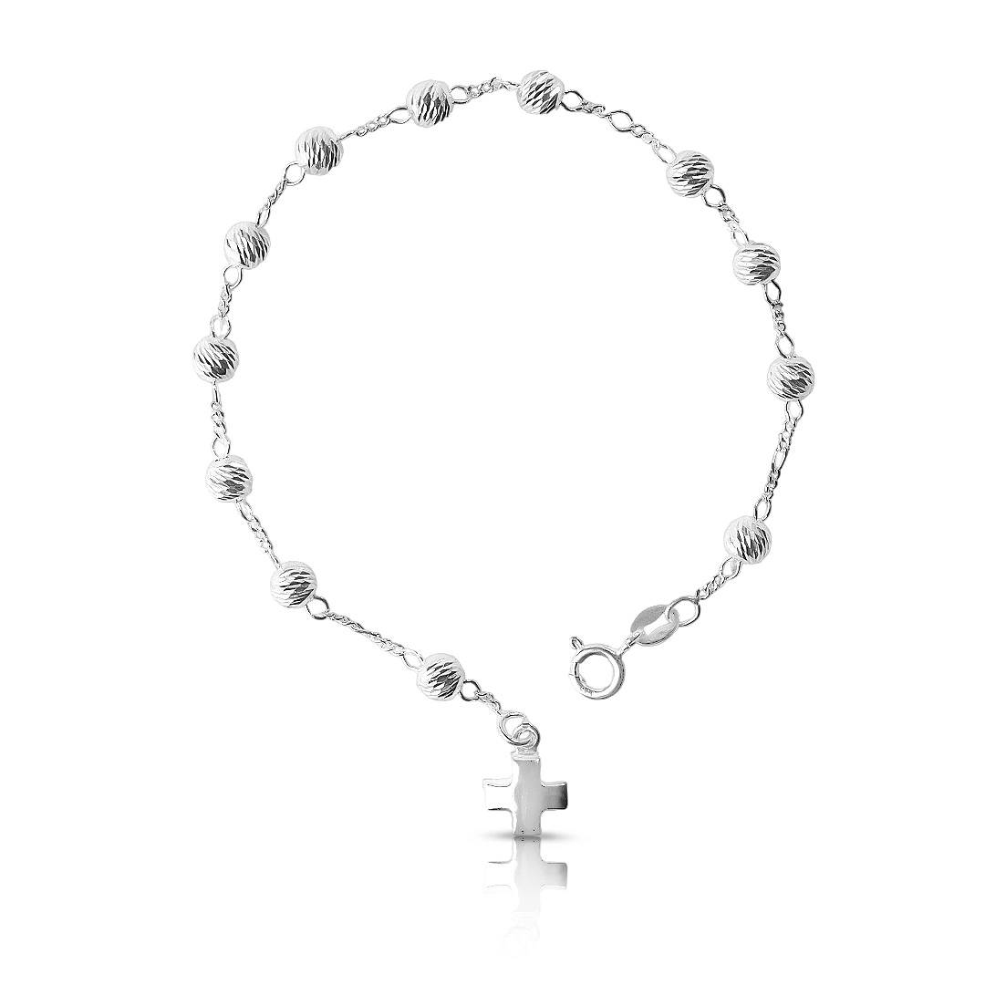Pulseira de Prata Estilo Terço com Esferas Diamantadas e Cruz