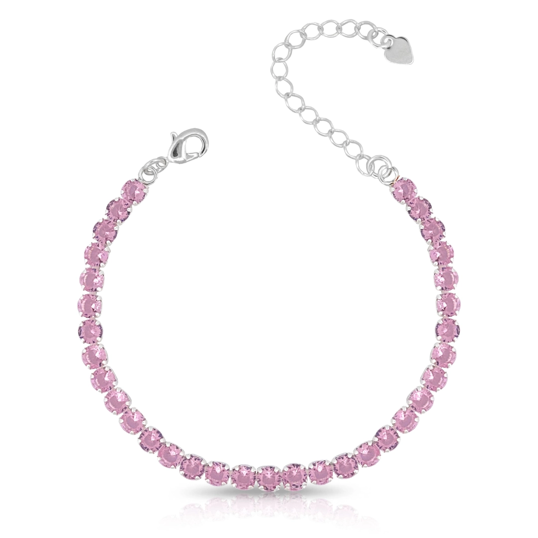 Pulseira riviera com zircônias no tom rosa em formato redondo.