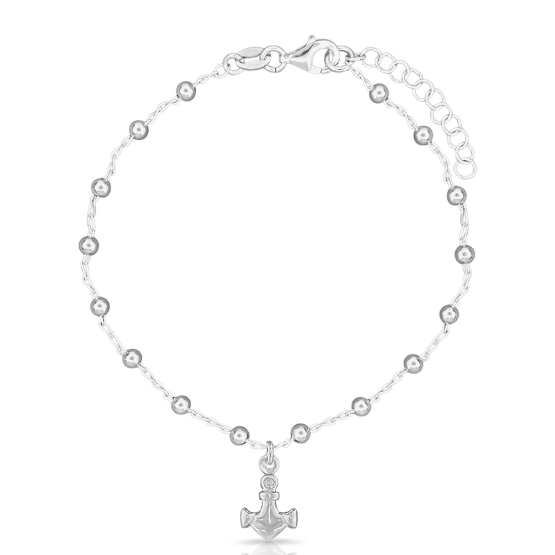 Tornozeleira de Prata Espelhada com Esferas e Âncora
