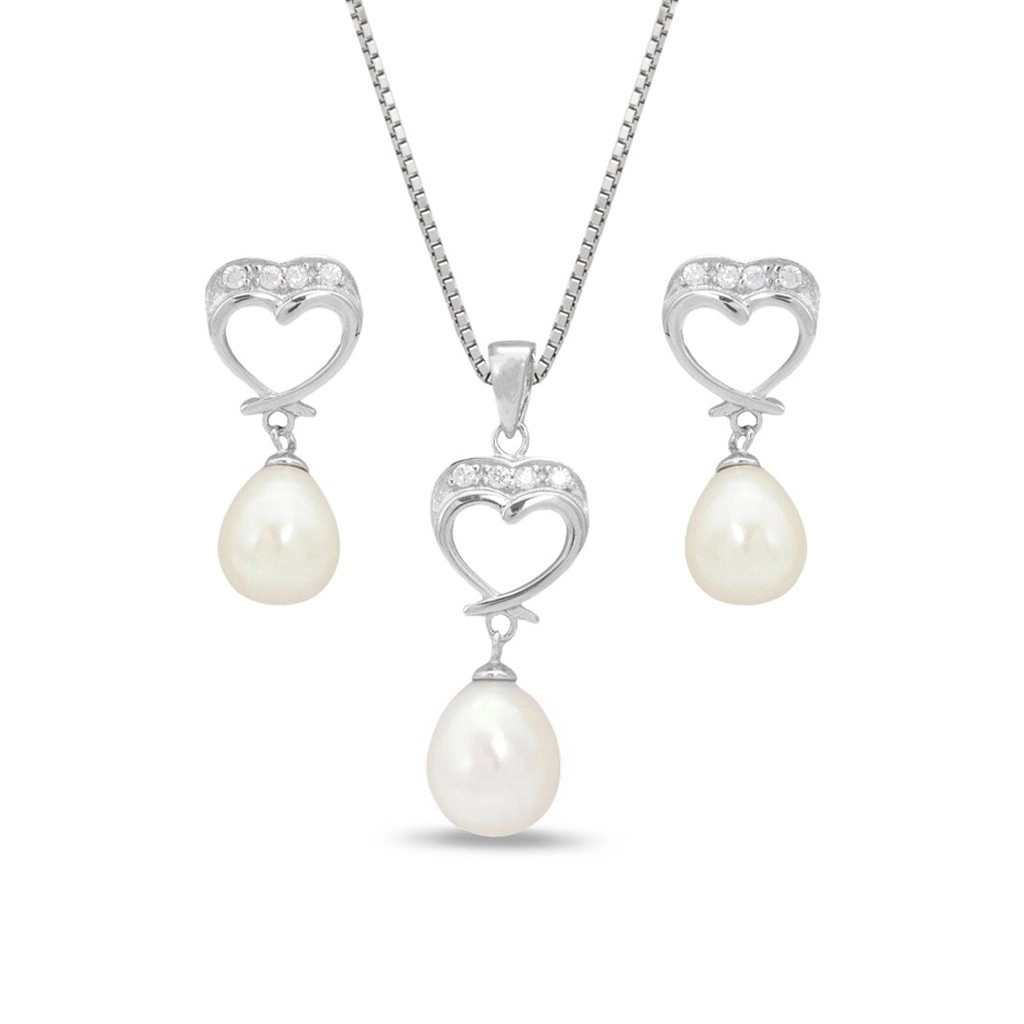 Gargantilha de Prata com Brincos e Pingente Coração de Zircônia Cristal e Pérola Biwa
